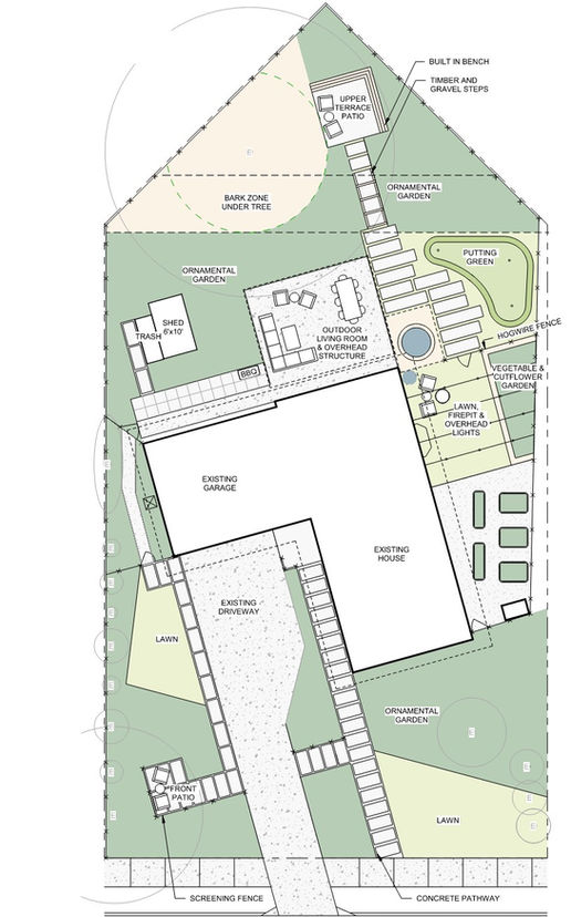 This residential master plan emphasizes seamless pedestrian connectivity from the street to the front home entrance, featuring a front patio and garden area. The private backyard living space has been expanded to include a covered patio, an ornamental garden, an upper terrace patio, a putting green, and a dedicated cut-flower garden.